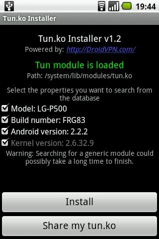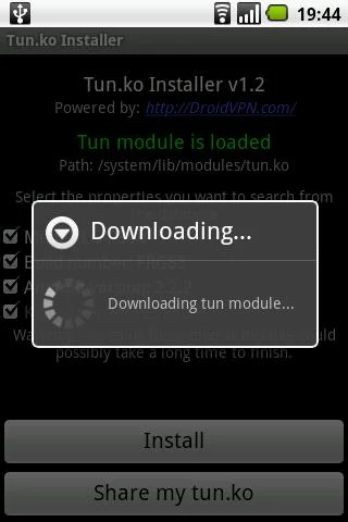 2. Descargar TUN.ko Installer y DroidVPN. Abrimos SÓLO el TUN.ko installer, y le dan a "Install"