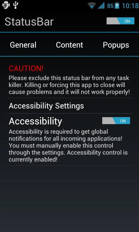 Esta es la barra de estado de IceCreamSandwich. Para que ICS StatusBar pueda manejar todas las notificaciones de terceros, debes darle permiso a través del menú de accesibilidad (en ajustes). Para ello, tienes que ir a Configuración> Accesibilidad> ICS StatusBar> Activar.