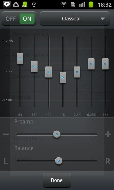 - Ecualizador gráfico optimizado de 10 bandas para todos los formatos admitidos, preajustes, preajustes personalizados